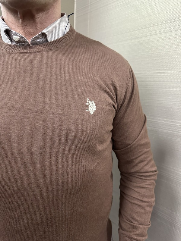 Maglia girocollo US POLO color tabacco con logo del cavallino a contrasto 90%cotone 10%cashmere disponibile in altri colori vestibilità regolare