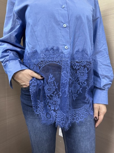 Camicia MARYLEY in cotone con pizzo nella parte finale colore celeste,100%cotone vestibilità regolare la modella indossa una tg.M per 1,70h