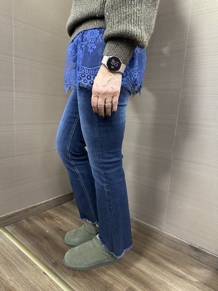Jeans semi zampa elasticizzato lavaggio blue denim, fit regolare gamba stretta e leggermente svasato nella parte finale 62%cotone 36%poliestere 2%elastane la modella indossa una tg.M per 1,70h