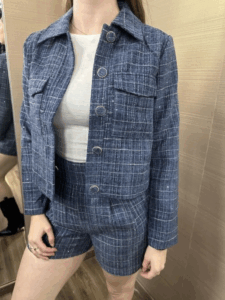Giacchina chanel color blue a quadric lurex di MOLLY BRACKEN 70%poliestere 30%cotone la modella indossa una tg.M per 1.70h