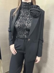 Giacca monopetto MIMI'-MUA' con spilla rimovibile colore nero (disponibile anche bordeaux) possibilità di abbinarla a due modelli di pantalone:sigaretta o palazzo 88%poliestere 12%elastane