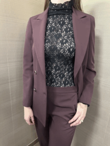 Giacca doppio petto MIMI'-MUA' colore bordeuax (disponibile anche nero) possibilità di abbinarla a due modelli di pantalone:sigaretta o palazzo 88%poliestere 12%elastane