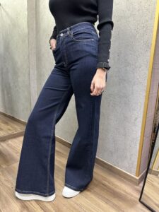 Jeans semi zampa elasticizzato lavaggio blue denim, fit regolare gamba stretta e leggermente svasato nella parte finale 62%cotone 36%poliestere 2%elastane la modella indossa una tg.M per 1,70h