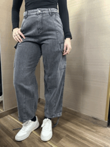 Jeans cargo PONT color grigio fumo 50%cotone 40%lyocell 10%modal la modella indossa una tg.S per 1.70h