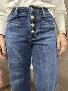Denim flare TAKE TWO con bottoni gioiello, tela elasticizzata 91%cotone 8%poliestere 1%elastane La modella indossa una tg.29 per 1.70h