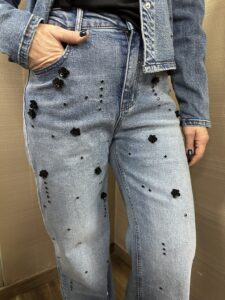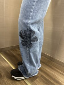 Jeans con ricamo floreale a contrasto nero MIMI'-MUA' 74%cotone 24%poliestere 2%spandex ottima vestibilità la modella indossa una tg.S per 1.70h