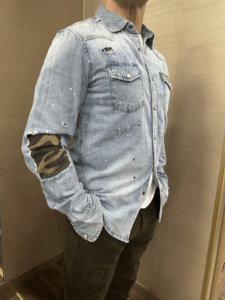 Camicia jeans GIANNI LUPO lavaggio chiaro effetto schizzo e strappi cuciti tasca e toppa militare 100%cotone il modello indossa una tg.S per 1.70h
