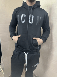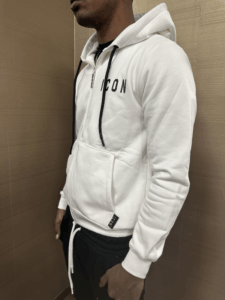 Felpa fullzip con cappuccio e zip ICON disponibile in bianco e nero 65%cotone 35%poliestere il modello indossa una tg.L per 1.80h