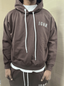 Felpa con cappuccio ICON colore marrone 87%cotone 13%poliestere il modello indossa una tg.L per 1.80h