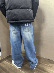 Jeans ICON modello baggy fit morbido, tela ferma,catenna logata accessorio compresa logo piccolo nella tasca dietro il modello indossa una tg.32 per 1.80h