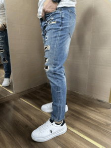 Jeans GIANNI LUPO con strappi cuciti e toppe fantasia militare 100%cotone il modello indossa una tg.44 per 1.70h