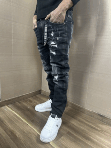 Jeans ICON modello skinny color nero con strappi cuciti e logo piccolo nella tasca dietro il modello indossa una tg.46 per 1.80h