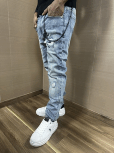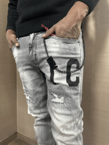 Jeans ICON modello skinny lavaggio chiaro con catena accessorio logata compresa strappi cuciti e logo piccolo nella tasca dietro il modello indossa una tg.34 per 1.80h