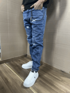 Jeans ICON modello skinny lavaggio blu scuro con strappi cuciti e logo catena accessorio compresa logo piccolo nella tasca dietro il modello indossa una tg.46 per 1.80h