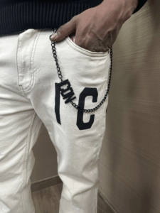 Jeans ICON modello skinny color ghiaccio logo sottotasca laterale e catena accessorio compresa il modello indossa una tg.34 per 1.80h