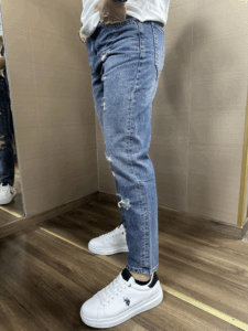 Jeans GIANNI LUPO con strappi, lavaggio blue denim 97%cotone 3%viscosa il modello indossa una tg.44 per 1.70h