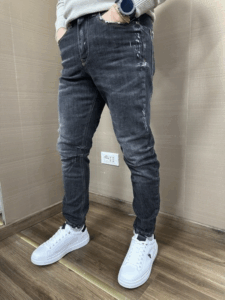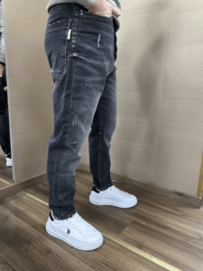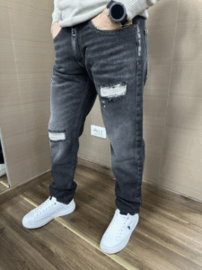 Jeans DISPLAJ modello cube lavaggio nero stone washed  con strappi vestibilità comoda e leggermente sceso sulla scarpa il modello indossa una 44 per 1.70h 100%cotone