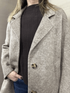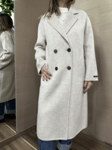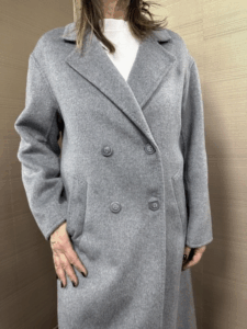 Cappotto mohair MIMI-MUA' color grigio modello doppio petto con vestibilità over 50%lana 50%poliestere la modella indossa una tg.M per 1.70h