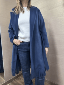 Cappotto con frange MIMI-MUA' colore blu, con cinturino rimovibile 100%poliestere la modella indossa una tg.M per 1.70h