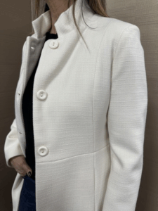 Cappotto modello baronetto MIMI-MUA' con colletto alla coreana disponibile in bianco e nero 85%poliestere 15%elastomero la modello indossa una tg.L per 1.70h (consigliata una tg.in più)