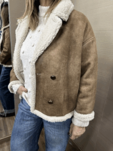Shearling MARKUP color cacao chiusura con cinturino al collo e bottoni a calamita esterno shell:100%poliestere vestibilità regolare la modella indossa una tg.M per 1,70h