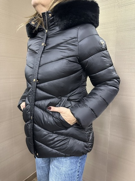 Piumino ARTIGLI lucido nero con cappuccio rifinito in ecofur rimovibile