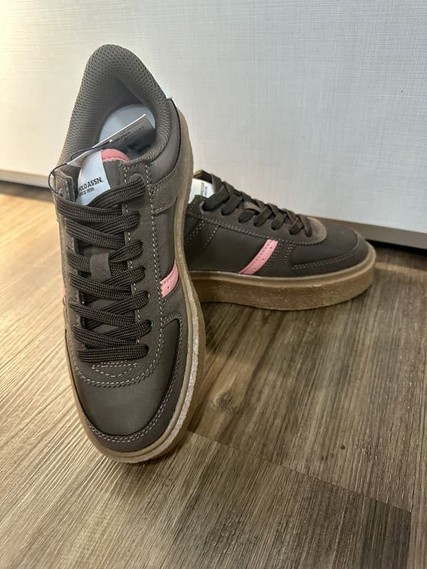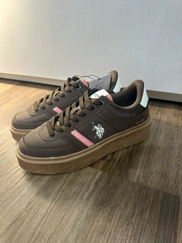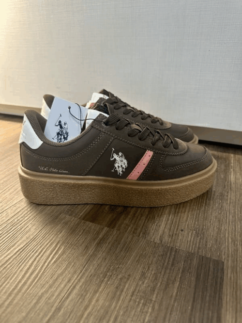 Sneakers US POLO color marrone con cavallino bianco a contrasto e dettaglio rosa, suola in gomma e tomaia in pelle