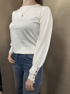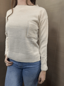 Maglia MOLLY BRACKEN girocollo color panna con fiocchi nel giromanica 39%poliestere 35%acrilico 20%poliammide 6%lana la modella indossa una tg.M per 1.70h