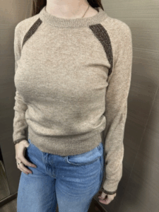Maglia MARKUP girocollo con dettagli bronzo lurex nel giromanica e nel polsino 45%poliestere 33%poliestere 13%acrilico 6%lana 3%elastane la modella indossa una tg.M per 1.70h