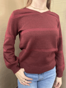 Maglia MARKUP con scollo V e dettagli lurex disponibile in bordeaux e blu 48%poliestere 14%poliestere 12%nylon 6%lana 5%lurex 3%elastane la modella indossa una tg.M per 1.70h