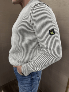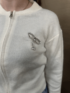 Maglia MARKUP con zip e spilla gioiello disponibile nel bianco e nel grigio 45%poliestere 33%poliestere 13%acrilico 6%lana 3%elastane la modella indossa una tg.M per 1.70h