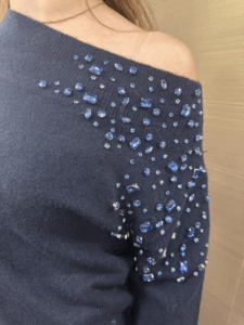 Maglia MARKUP scollo a barca con dettaglio brillocchi disponibile in blu e bordeaux 53%polistere 39%acrilico 5%lana 3%elastane lsa modella indossa una tg.M per 1.70h