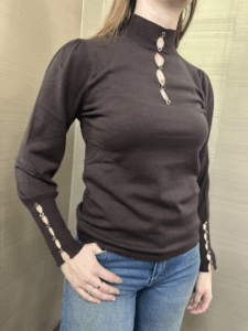 Maglia MOLLY BRACKEN colore moro con cut out davanti e bottoni oro a contrasto 51%viscosa 30%poliestere 19%poliammide la modella indossa una tg.S per 1.70h