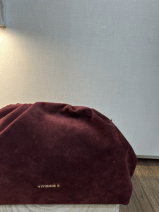 Mini bag scamosciata con logo VIVIENNE-D finitura dorata Lavorazione intrecciata Chiusura con automatico Manico singolo Dimensioni:17x12x6