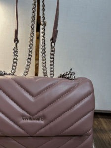 Mini bag in ecopelle VIVIENNE-D finitura argentata con due tasche interne di cui una con zip, lavorazione trapuntata chiusura con automatici manico a catena scorrevole comparto in ecopelle, doppio scomparto interno fodera 100%poliestere dimensioni:26x18x10
