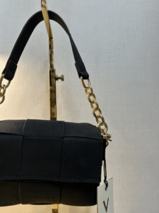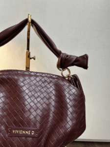 Mini bag in ecopelle con logo VIVIENNE-D finitura dorata lavorazione intrecciata chiusura con cerniera manico singolo con nodi dimensioni:24x14x11