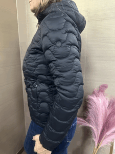Piumino 100 grammi con cappuccioi tessuto lavorato MONT ROSE colore nero tessuto esterno:100%poliammide tessuto interno:100%poliestere imbottitura:100%poliestere la modella indossa una tg.M per 1.70h