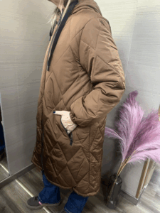 Piumino lungo SOYA CONCEPT color cioccolato trapuntato con cappuccio 100%poliestere la modella indossa una tg.S per 1.70h