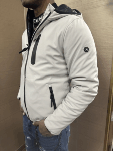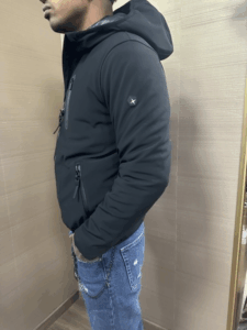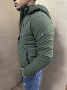 Piumino tessuto tecnico con cappuccio,idrorepellente tessuto esterno 75%poliammide 25%elastane interno e imbottitura 100%poliestere consigliata una taglia in più il modello indossa una tg.L per 1.80h