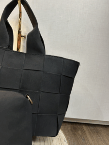 Shopper scamosciata con logo VIVIENNE-D finitura dorata Lavorazione intrecciata Chiusura con automatico e busta interna doppio manica e tracolla removibile
