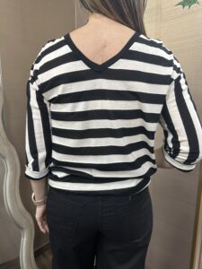 Maglia a righe con scollo V dietro AKÈ 50%cotone 50%viscosa la modella indossa una tg.M per 1.70h disponibile in nero e fango