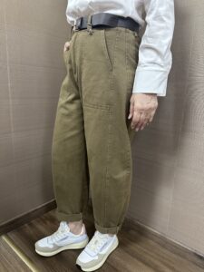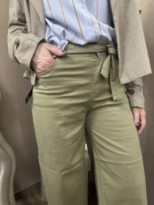 Pantalone cropped palazzo in cotone con fusciacca AKÈ 98%cotone 2%poliestere la modella indossa una tg.44 per 1.70h disponibile in verde oliva, bianco e nero