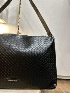 Borsa in ecopelle con logo VIVIENNE-D finitura dorata Lavorazione intrecciata Chiusura con cerniera Manico singolo Dimensioni:45x30x5