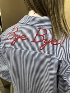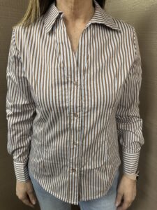 Camicia a righe con ricamo "bye bye" AKÈ 70%cotone 30%poliestere la modella indossa una tg.M per 1.70h