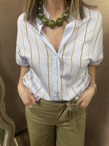 Camicia 1/2 manica AKÈ a righe celeste e verde con scollo V + bottoni 85%viscosa 15%poliestere disponibile dalla S alla L la modella indossa una tg.M per 1.70h